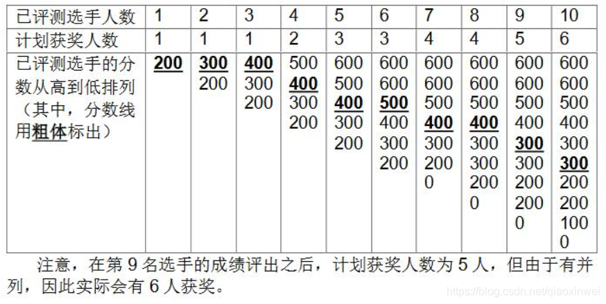 更具体地,若当前已评出了 p 个选手的成绩,则当前计划获奖人数为 max ( 1 , ⌊ p ∗ w % ⌋ ) ,其中 w 是获奖百分比, floor ⌊x⌋ 表示对 x 向下取整,max(x,y) 表示 x 和 y 中较大的数。如有选手成绩相同,则所有成绩并列的选手都能获奖,因此实际获奖人数可能比计划中多。作为评测组的技术人员,请你帮 CCF 写一个直播程序。